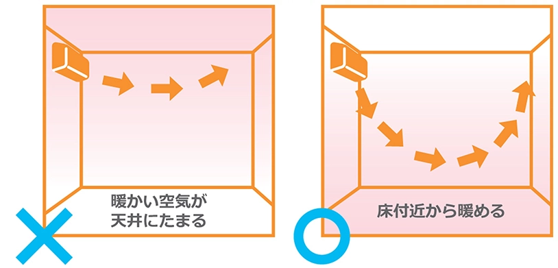 暖かい空気は上昇する性質があるため、暖房中は天井付近と床付近の温度に差が出る「温度ムラ」が起こりやすくなります。室内機で吸い込んだ空気の温度から室温を判断しているエアコンは、天井に暖気がたまっていると、床付近が肌寒くても運転をゆるめてしまいます。エアコンの設定温度を上げれば足元の肌寒さも和らぎますが、その分消費電力は増加してしまいます。「温度ムラ」を抑える工夫として、エアコンの暖房運転時の風向は、できるだけ下向きにしましょう。