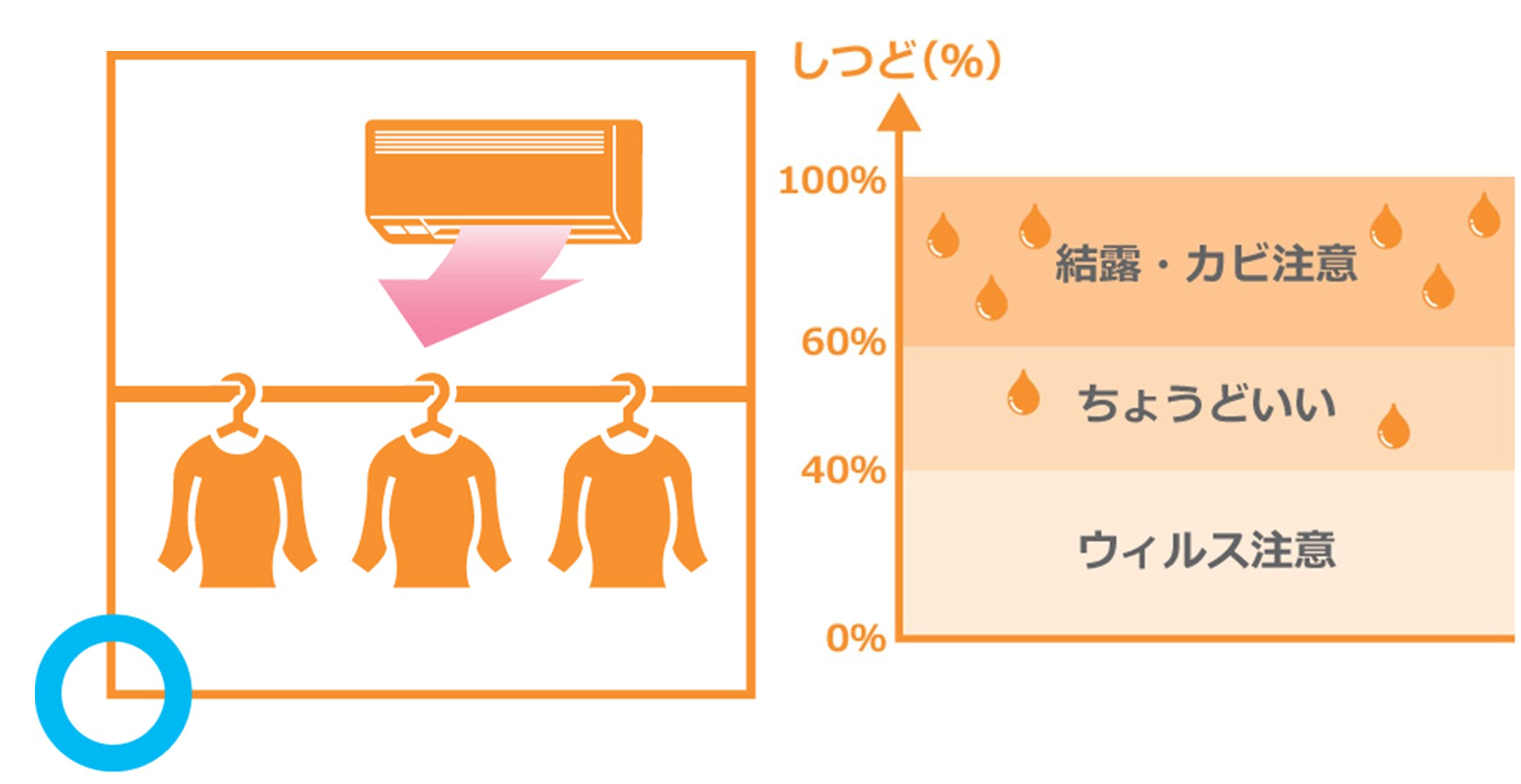 なお、室内の加湿は体感温度を上げるだけでなく、ウイルスの抑制にもつながると言われています。ただし、湿度を上げ過ぎると結露やカビの発生につながる場合もあるので、湿度は40~60%を目安にしましょう。