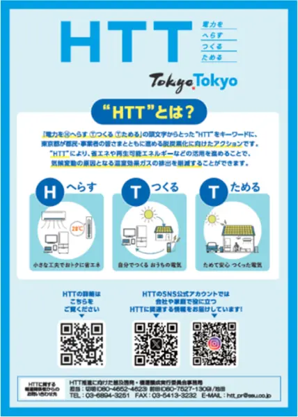 HTTとは、電力を「H(減らす)T(創る)T(蓄める)」をキーワードに、都民や事業者の皆さまと共に、気候危機への対応だけでなくエネルギーの安定確保に向けたアクションを推進する取組です。今年度はHTTの取組に積極的にご協力いただける様々な企業等との連携を推進し、より多くの都民・事業者に向けて、HTTに関する理解促進等を進めていきます。